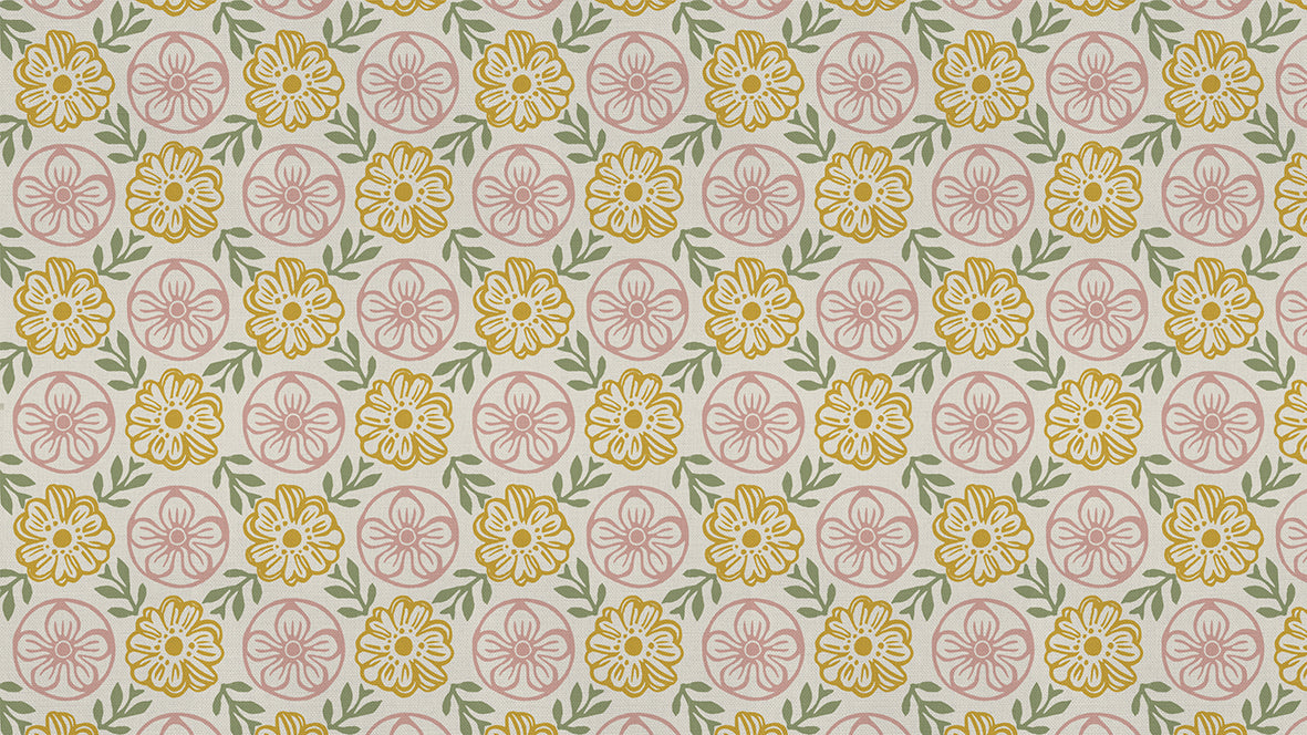 Snowshill is available in two colour ways; Raspberry, and Yellow, which both have secondary colours too, so it's easy to coordinate with many paint schemes. Our base cloth is a linen union from Scotland; (51% linen /49% cotton).