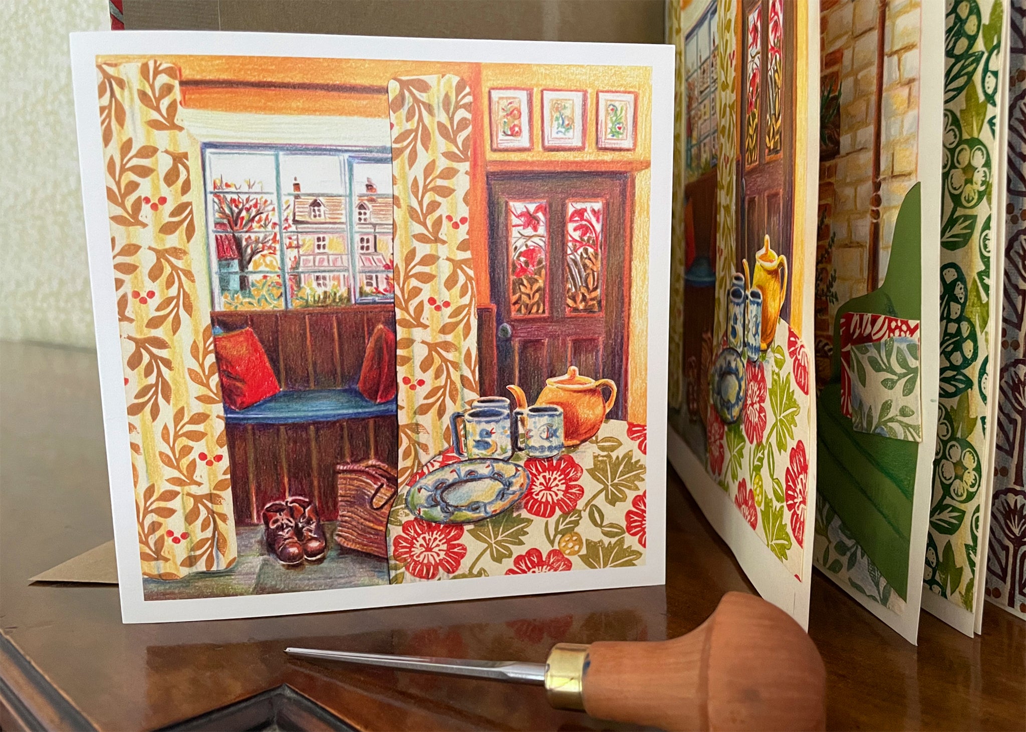 This card is a reproduction of a mixed media artwork called 'Boots & Basket', which combines lino printed patterns and pencil crayon illustration of an imagined interior. It is loosely based on a wonderful room I visited in a Landmark Trust property, with my best friend, who always comes laden with baskets of all shapes and sizes.